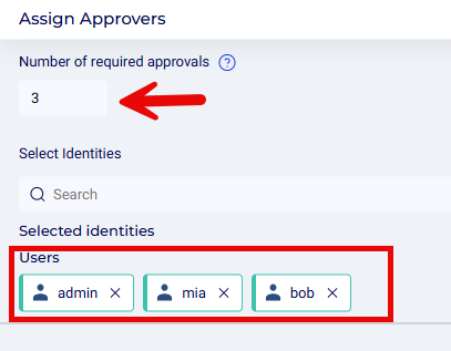 - Select and assign identities as Approvers. In the example below, 3 identities are assigned to the Approval entry.