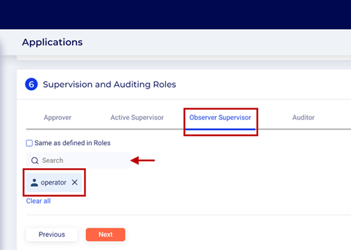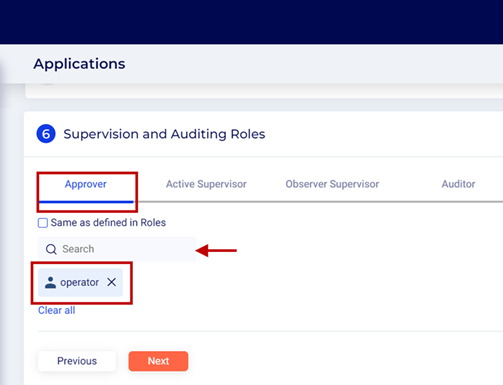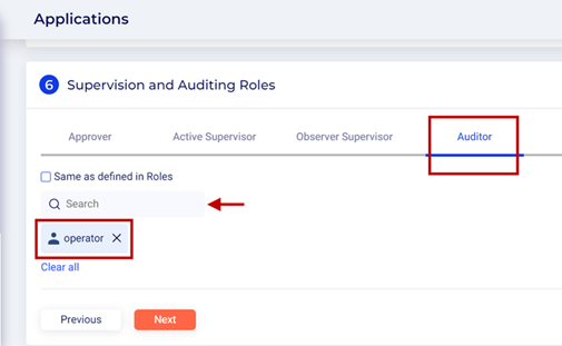 In the Supervision and Auditing Roles section, when creating applications, disable the Same as defined in Roles checkboxes under the Approver, Active Supervisor, Observer Supervisor, or Auditor tabs.