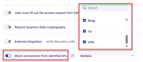 Block based on connection method - This setting allows you to define one or more connection methods - for example, VPN, Tor, Proxy, etc. - that will be blocked as part of the policy. See definition of each connection method below.