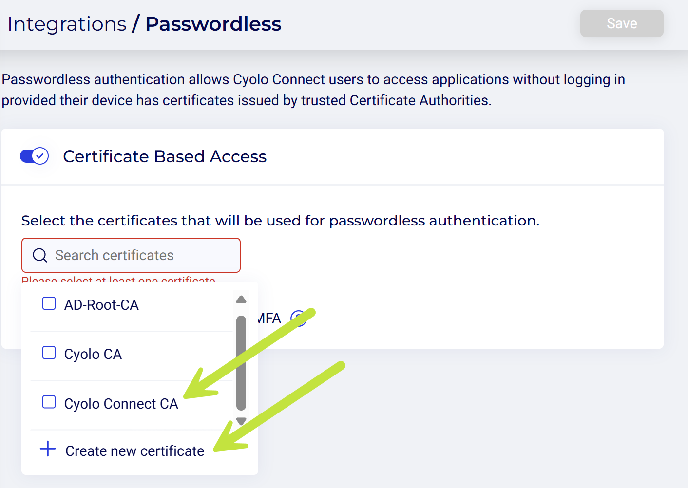 You can use Passwordless Authentication with the Cyolo Connect Certificate Authority or use your own.