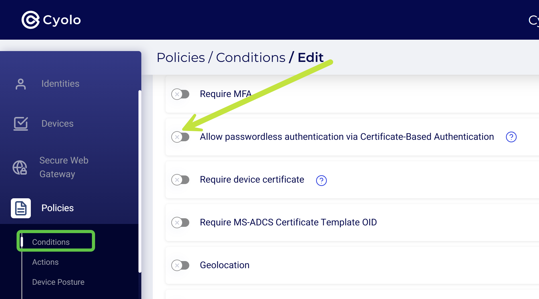 - Select Allow seamless certificate-based authentication in the condition policy settings.