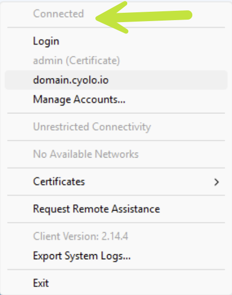 Users who are connected see a Cyolo Connect status of Connected. Note: the login option remains available for accessing applications that are not enabled for Passwordless Authentication.