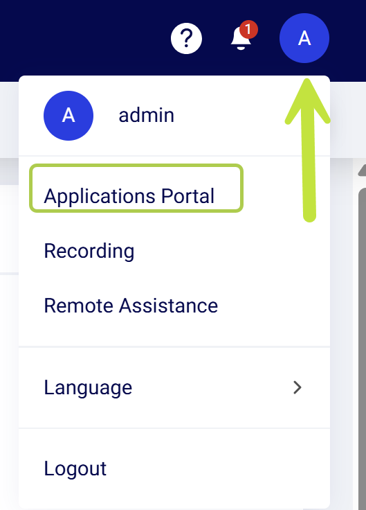 - Click the profile menu at the top right of the screen and select Applications Portal.