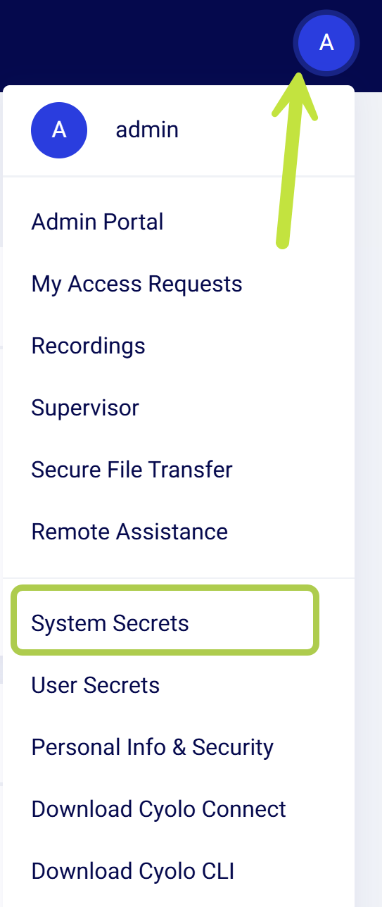 - Click the profile menu at the top right of the screen and select System Secrets.